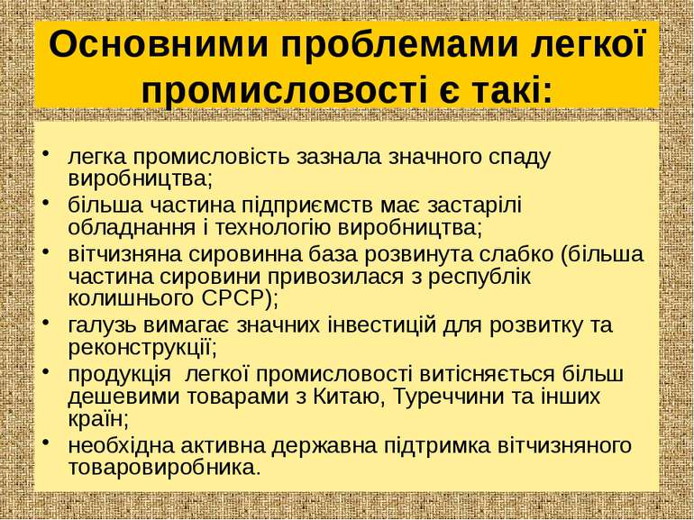 Легка промисловість в Україні має великий, недостатньо використаний потенціал: потужні виробничі можливості та достатня кількість кваліфікованих трудових ресурсів. Через недостатнє постачання імпортної сировини виробничі потужності недовантажено. Засилля внутрішнього ринку турецькою та білоруською продукцію витісняє вітчизняного виробника. Необхідно звернути увагу на використання нових видів сировини, залучення іноземних інвестицій, що дадуть змогу більш системно використовувати сучасні виробничі технології.