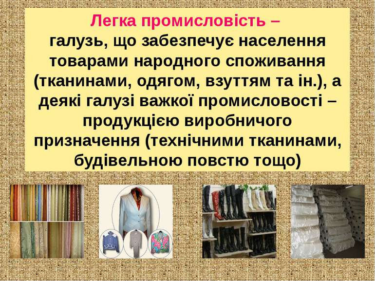 Легка промисловість України охоплює галузі, що виробляють товари народного споживання — тканини, одяг, взуття, предмети галантереї та парфумерії тощо. Серед них — текстильна, швейна, трикотажна, шкіряно-галантерейна, взуттєва, хутрова та інші галузі. Крім того підприємства легкої промисловості виробляють й товари виробничого призначення – корд, канати, штучну шкіру тощо.